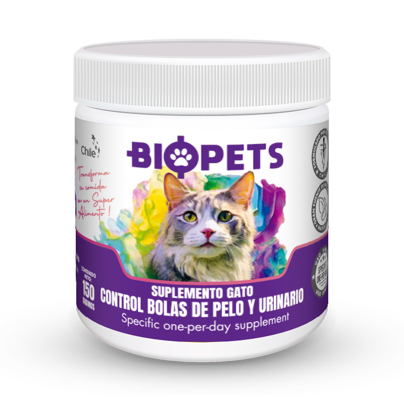 BIOPETS GATO CONTROL BOLAS DE PELO Y URINARIO es un suplemento nutricional, formulado por médicos veterinarios expertos en nutrición, con ingredientes naturales. Estos entregan importantes nutrientes como: aminoácidos, vitaminas, minerales y nutrientes funcionales (nutraceúticos). Mejora la salud intestinal, la respuesta inmunológica y la condición del pelaje.